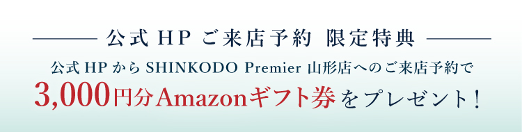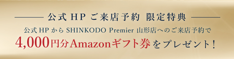 土・日・祝日は混み合うことがありますので事前のご予約をおすすめしております。また、SHINKODO Premier 山形店限定で、WEBからの来店予約で【Amazonギフト券4,000円分】をプレゼントしております。是非ご利用くださいませ。